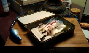 The last two flies to join the box were an olive streamer and something else. I don’t know what to call it. It’s some kind of winged dry fly. I had a really nice mallard flank that I needed to do something with and I decided to tie it to a hook. I’ve got expectations for the streamer, as usual, but the other one is just an aesthetic fly.