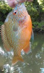 Not long after this epiphany struck me, I decided to come about as close to “matching the hatch” as I ever have. I used some caddis flies and bumble bee poppers and the end of my line came alive! Okay, maybe that was too dramatic, but I did catch some fish.  Nothing huge though. If there were any smallmouth bass in there then they really didn’t have a chance at much because the sunfish were biting at just about everything. I was able to hook a pumpkin seed (actually it’s a longear sunfish. Thanks, Mark!), which is a fish I haven’t seen much of recently, and easily my favorite sunfish to look at.